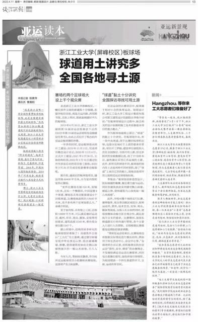 4月11日,《錢江晚報(bào)》“亞運(yùn)新景觀”欄目以《球道用土講究多 全國(guó)各地尋土源》為題,報(bào)道我校(屏峰校區(qū))亞運(yùn)板球場(chǎng)的建設(shè)情況,介紹了板球場(chǎng)的特色以及工大志愿者啟動(dòng)儀式的活動(dòng)情況。