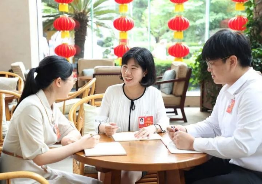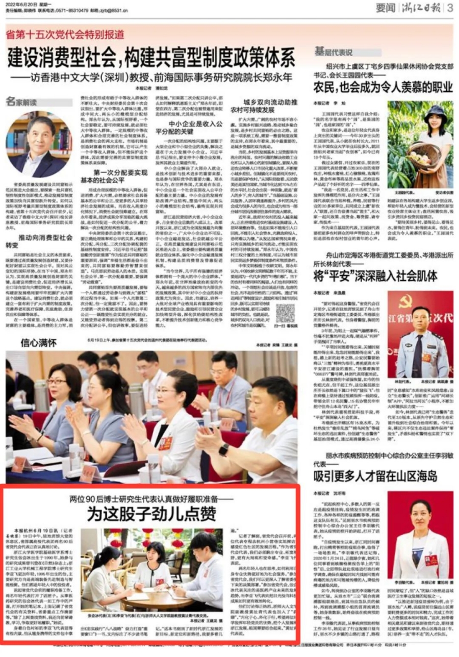 他們討論得正熱烈,省黨代會代表、浙江師范大學人文學院副教授黃沚青也加入了“群聊”。作為教師的她,為兩名學生代表的認真點贊?!皟然谛摹⑼饣谛?,希望兩位同學發(fā)揮年輕黨員的力量,把個人發(fā)展和浙江發(fā)展、祖國需要結合起來?!秉S沚青代表說。