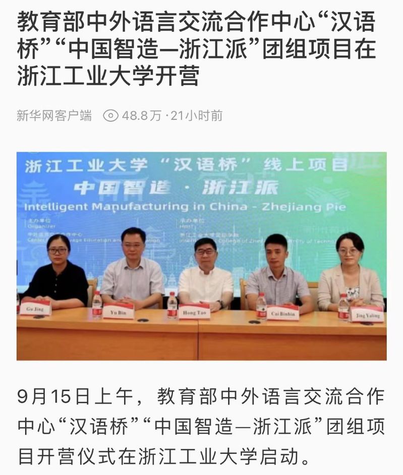 9月15日,新華網(wǎng)客戶端報道教育部中外語言交流合作中心“漢語橋”“中國智造—浙江派”團組項目開營儀式在我校啟動。