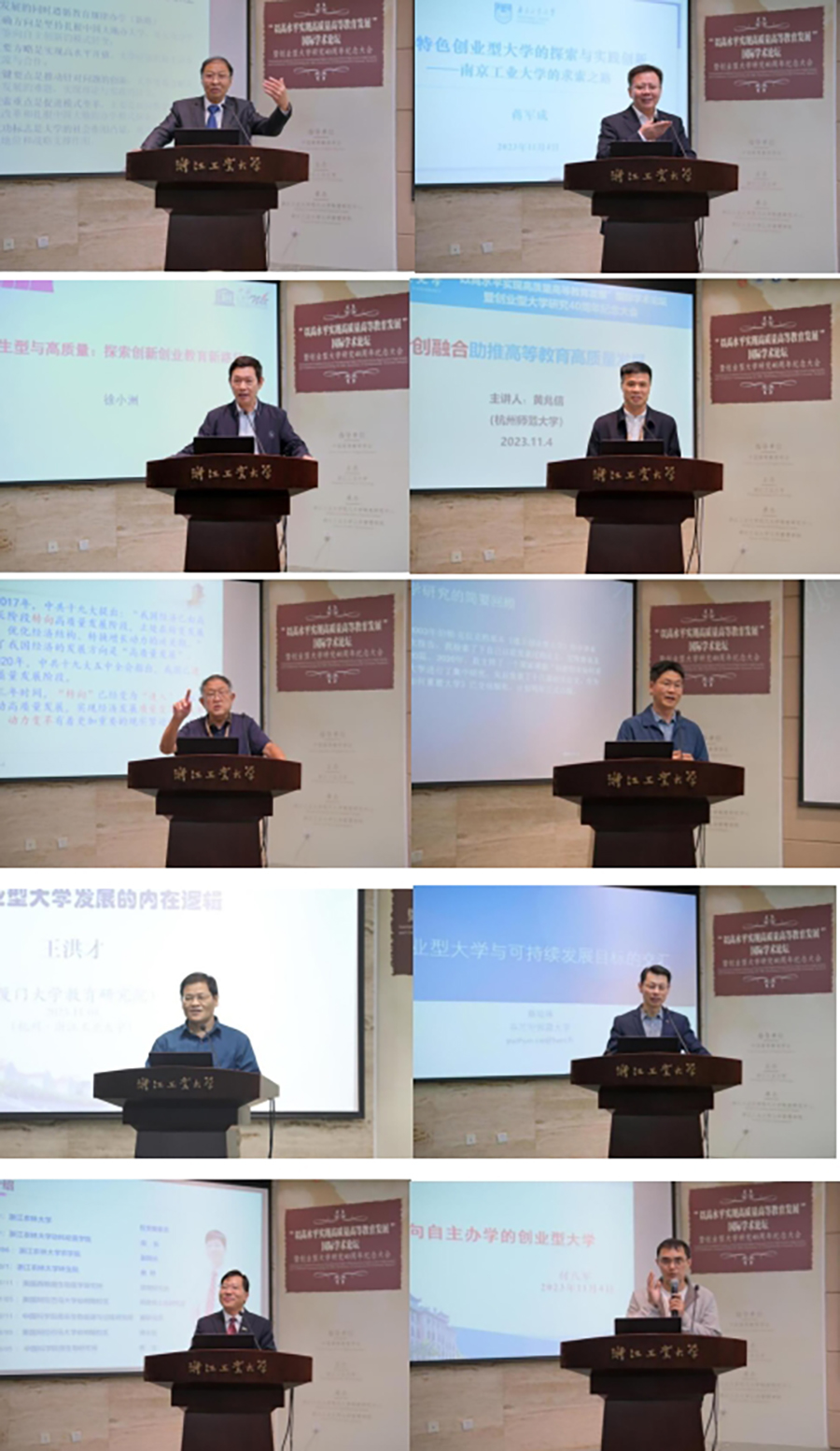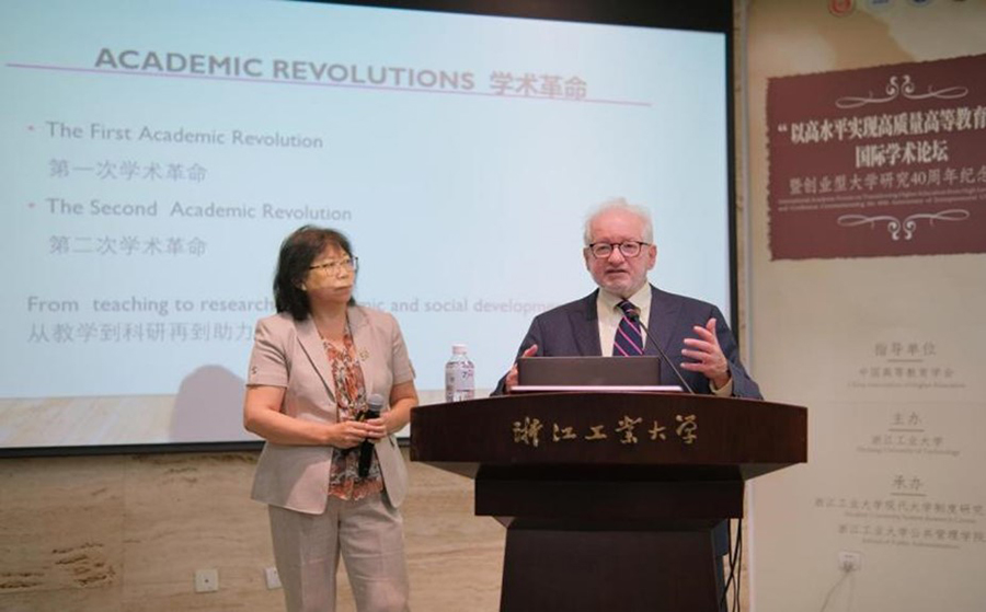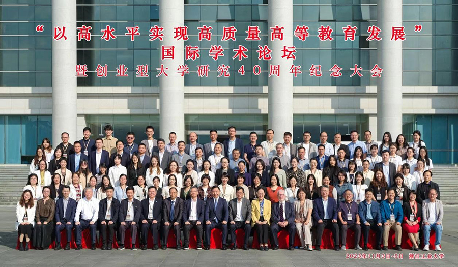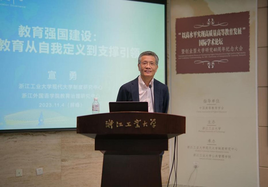 11月4日,由中國高等教育學(xué)會指導(dǎo),我校主辦,我校現(xiàn)代大學(xué)制度研究中心、公共管理學(xué)院承辦的“以高水平實現(xiàn)高質(zhì)量高等教育發(fā)展”國際學(xué)術(shù)論壇暨創(chuàng)業(yè)型大學(xué)研究40周年紀念大會召開。中國高等教育學(xué)會副會長、秘書長姜恩來,學(xué)校黨委書記蔡袁強出席論壇并致辭,我?,F(xiàn)代大學(xué)制度研究中心主任、浙江外國語學(xué)院黨委書記宣勇出席并作總結(jié)報告。我校黨委副書記陳杰、中國高等教育學(xué)會秘書處學(xué)術(shù)與交流部主任高曉杰分別主持開幕式與主論壇。