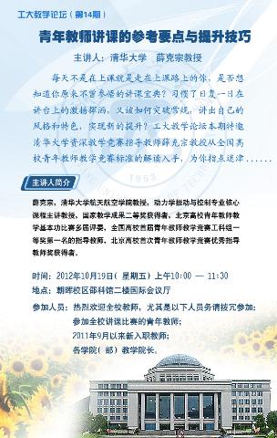 主講人:清華大學薛克宗教授 時 間:10月19日上午10:00-11:30 地 點:朝暉校區(qū)邵科館二樓國際會議廳
