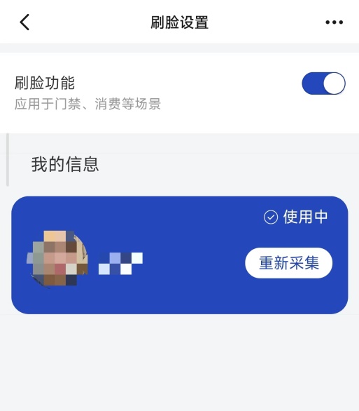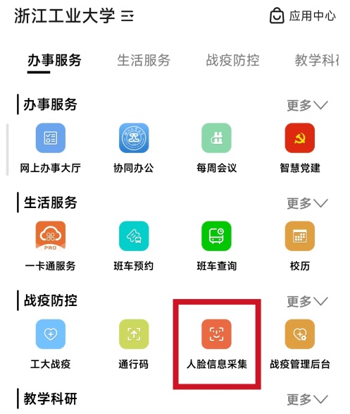 通過“工大釘”工作臺—“戰(zhàn)疫防控”版塊—“人臉信息采集”應用進入采集界面。系統(tǒng)會獲取您的統(tǒng)一身份認證信息,請根據(jù)提示進行人臉圖片拍攝和上傳。用戶可隨時重新采集人臉信息、啟用或關閉刷臉功能等。